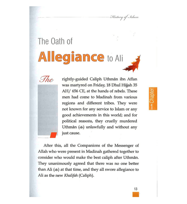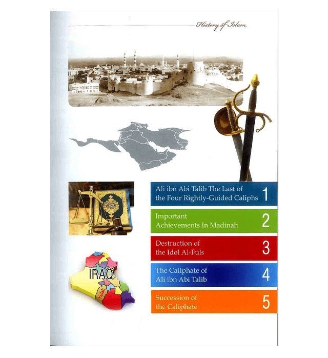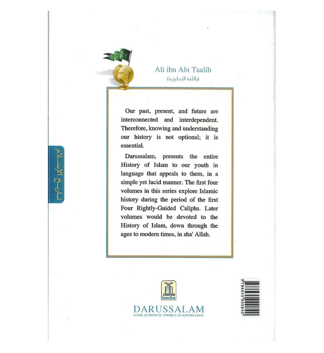 A Reader Series Ali ibn Abi Taalib R.A. Rightly-Guided Caliphs History of Islam The age of the rightly guided caliphs Al-Khulafa Ar-Rashidun This is the fourth volume from this series, which deals with the life of the last of the Four Rightly-Guided Caliphs, Ali ibn Abi Talib (R.A) . He was the first male to accept Islam at the young age of approximately nine years. He was the Prophet's صلی الله علیهِ وآله وسلم cousin, the son of Abu Talib, the Prophets صلی الله علیهِ وآله وسلم supportive and loving uncle who protected him during the worst trials of his early Prophethood. Ali's devotion to the Prophet صلی الله علیهِ وآله وسلم is best evidenced during the Hijrah (migration) when he acted as the Prophet's صلی الله علیهِ وآله وسلم decoy in Makkah while the Prophet صلی الله علیهِ وآله وسلم left under the cover of night and migrated to Madinah, accompanied by Abu Bakr R.A. Darussalam presents the entire History of Islam to our youth in language that appeals to them, in a simple yet lucid manner. The first four volumes in this series explore Islamic history during the period of the first Four Rightly-Guided Caliphs. Later volumes would be devoted to the History of Islam, down through the ages to modern times, inshaALLAH.